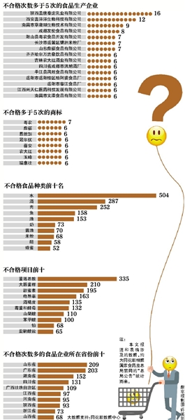 根據新京報統計,自今年1月1日至11月26日,國家食藥監總局在“總局公告”里公布了3600余批次不合格食品,有具名的“生產企業”2293家。根據同花順數據中心分析,449家企業被通報2次(含)以上,占19.6%。而被通報達5次及以上的企業數量為29家,占具名生產企業總數的1.3%。