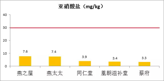 此次檢測結(jié)果顯示,五品牌燕窩的亞硝酸鹽含量均低于10mg/kg,符合限量值規(guī)定。