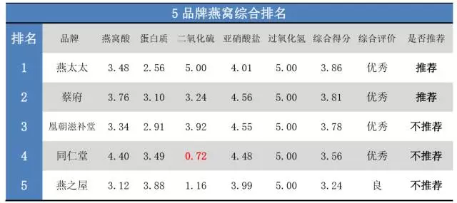 根據(jù)以上檢測結(jié)果,五大品牌燕窩的綜合排名為: