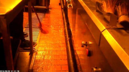 記者隨即被分配到廚房做一名配菜員,負(fù)責(zé)配置醬料和菜品原料。記者發(fā)現(xiàn),廚房墻面和地面常常積累了污水和油漬,為了保潔,廚房師傅便不定期對墻面和地面進(jìn)行刷洗和清掃,而在清掃之后,廚房師傅竟將掃把放入用于做菜的鍋內(nèi)進(jìn)行漂洗。見記者表情驚訝,旁邊的一名廚房師傅不以為然地說:“這里本來就是掃把洗鍋??!”