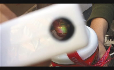 拆開其中一箱的包裝,這是一款經(jīng)典“飛天茅臺”的假酒,從外觀上看這與真酒沒有區(qū)別。包裝內(nèi)還自帶防偽器,對假酒進行檢驗,可見酒瓶蓋顯現(xiàn)跟真茅臺酒一樣彩虹狀的北京和“國酒茅臺”字樣。