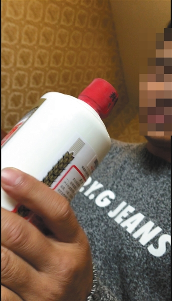 2月14日,張建拿出一瓶假茅臺酒樣品給記者展示。