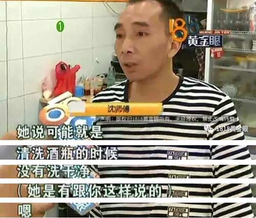 沈師傅:“肯定是那個瓶子在沒有清洗之前,有污垢掉進去,然后在清洗瓶子的時候,工人沒有清洗干凈。”