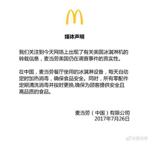 7月26日23時許,麥當勞官方微博發布了《關于美國冰淇淋機的媒體聲明》:“我們關注到今天網絡上出現了有關美國冰淇淋機的轉載信息,麥當勞美國仍在調查事件的真實性。在中國,麥當勞餐廳使用的冰淇淋設備,每天自動定時加熱消毒,確保食品安全。同時,所有零配件定期清洗消毒并按時更換,確保為顧客提供安全且高品質的食品。”