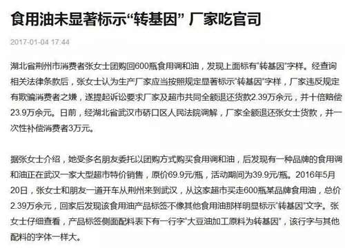 食談君還發現,在今年1月份,湖北省荊州市張女士團購了600瓶食用調和油,發現產品標簽側面配料表下有一行字“大豆油加工原料為轉基因”,但該行字與其他配料的字體一樣大。張女士認為該字體沒有體現“顯著標識”,為此上訴至法庭,要求退一賠十。后來在法庭的調解下,張女士退貨,廠家一次性補償了張女士3萬元。