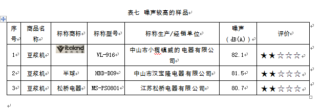 18款樣品,在制漿時間和噪聲等性能方面差異較大。制漿時間最短的為22分鐘,最長的為34分鐘,相差12分鐘。其中,制漿時間低于25分鐘的有3件,制漿時間超過30分鐘的有5件(見表六)。在噪聲方面,最低為67.3 dB(A),最高的達到了82.1 dB(A),其中有3件樣品的噪聲過高,超過80 dB(A)(見表七)。