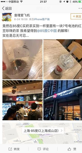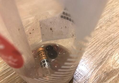 昨日,張小姐透過外賣平臺訂購了三杯85°C飲品,其中一杯是紅豆珍珠奶茶。當奶茶喝到快見杯底時,混在在珍珠和紅豆里的一硬物引起了她的注意。“奶茶里居然有一節7號電池!這是要給我補充電解質嗎?”張小姐說,電池當時橫置在杯底部,約1/2浸沒在奶茶中和配料中。她懷疑電池應該是一開始就混在原料紅豆或珍珠里,或許其他消費者也會“幸運”買到“電池紅豆珍珠奶茶”。發現這一情況,張小姐隨即前往店家交涉。店家愿意給予其10倍奶茶錢款的賠償,被她拒絕了。“知名飲品甜點店85℃食品安全做的如此糟糕,如何讓消費者買的放心、吃的放心。”最讓她擔心的是,電池本身帶有毒性,喝了這樣一杯“毒奶茶”,目前也不清楚是否會對身體造成不良后果。由于昨晚要出門旅行,張小姐并未與店家達成一致。