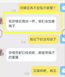我又問對方的客服,是否可以保證按訂單的貨發給我,對方直接告訴我,說明上已經明確告知,螃蟹是含繩子的分量的,寄回去以后,會多綁幾根繩子,保證不缺份量再寄給我,無圖無真相,我把螃蟹的照片和與對方的客服的對話發上來。