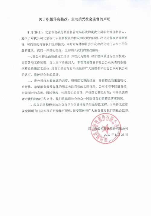 在后廚臟亂問題被曝光后,8月25日下午,海底撈先后發布《關于海底撈火鍋北京勁松店、北京太陽宮店事件的致歉信》、《關于海底撈火鍋北京勁松店、北京太陽宮店事件處理通報》,承認媒體披露的問題屬實,道歉并公布了整改措施。
