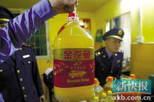 天河區工商所曾在一雜貨店查處340多罐假冒偽劣地溝油,不法商人將其假冒成"金龍魚"等食用油。