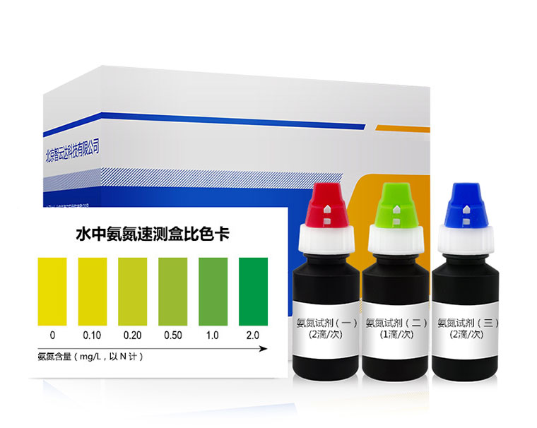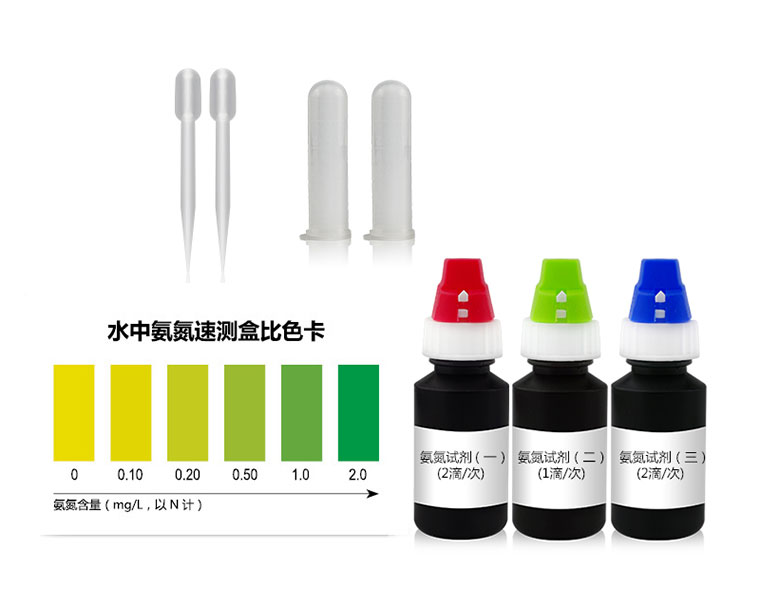 水中氨氮與檢測(cè)試劑反應(yīng)生成藍(lán)色物質(zhì),含量越高藍(lán)色或綠色越深。
