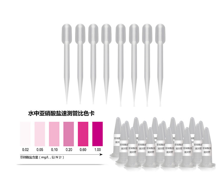 1. 直接取1.0mL水樣加入到速測管中進行檢測,振搖使試劑溶解,靜置10min后與比色卡對比,取相同或相近色階上標示值即為樣品中亞硝酸鹽的含量(以氮計)。