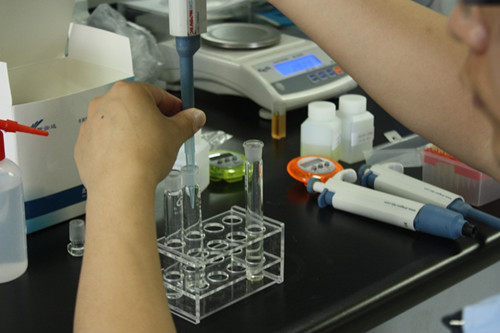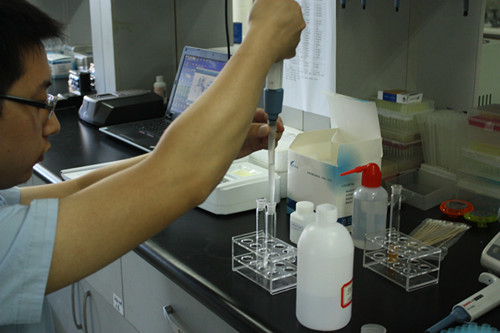 4、 取兩根試管,分別作為樣品管和對照管。在樣品管加入3ml樣品液,在對照管中加入3ml緩沖液,隨后分別加入20ul顯色劑和50ul酶試劑。蓋塞混勻靜置10min。