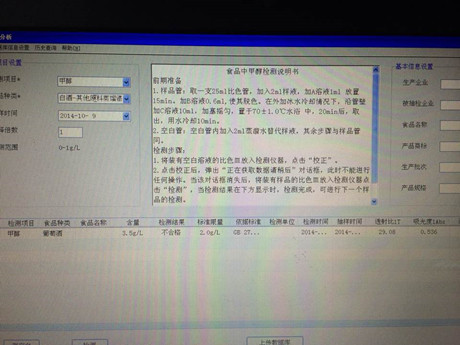 3、放入PCS食品安全快速檢測儀中檢測,檢測結果,甲醇含量為3.5g/L,大于國家標準400mg/L.