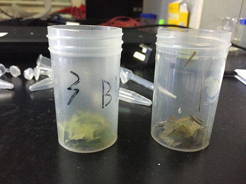 首先我們將文先生寄送過來的兩種粽葉都進行剪碎取樣,稱取 0.8g 樣品于提取瓶中,加蒸餾水或純凈水 20mL,蓋上蓋振搖 1 分鐘,放置 10min,期間可振搖加快提取,其上清液為樣品液。