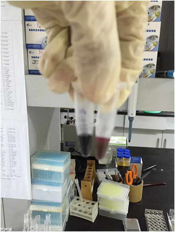 用滴管取0.04%甲醇標(biāo)液、酒樣各6滴于兩個離心管中,各加入5滴試劑1,放置5分鐘。