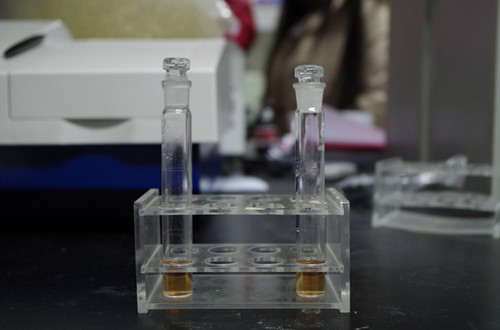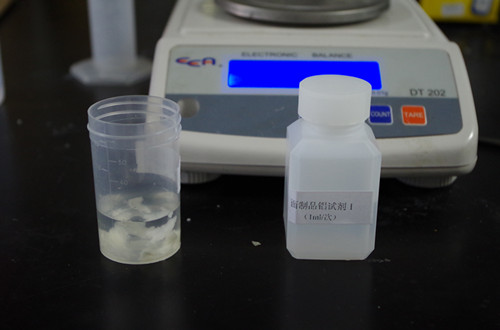 加入19 mL蒸餾水,加入1 mL試劑1,攪拌2分鐘,靜置3分鐘。