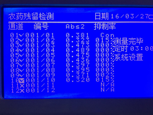 檢測結(jié)果如圖所示,結(jié)果以酶被抑制的程度,即抑制率表示。當(dāng)果蔬樣品提取液對酶的抑制率為40~50%時,則表明被測樣品為可疑農(nóng)殘超標(biāo)樣品;當(dāng)抑制率≥50%時,表示蔬菜中有高劑量有機磷或氨基甲酸酯類農(nóng)藥存在,樣品為陽性結(jié)果。所以樣品中農(nóng)藥殘留符合國家標(biāo)準(zhǔn)。